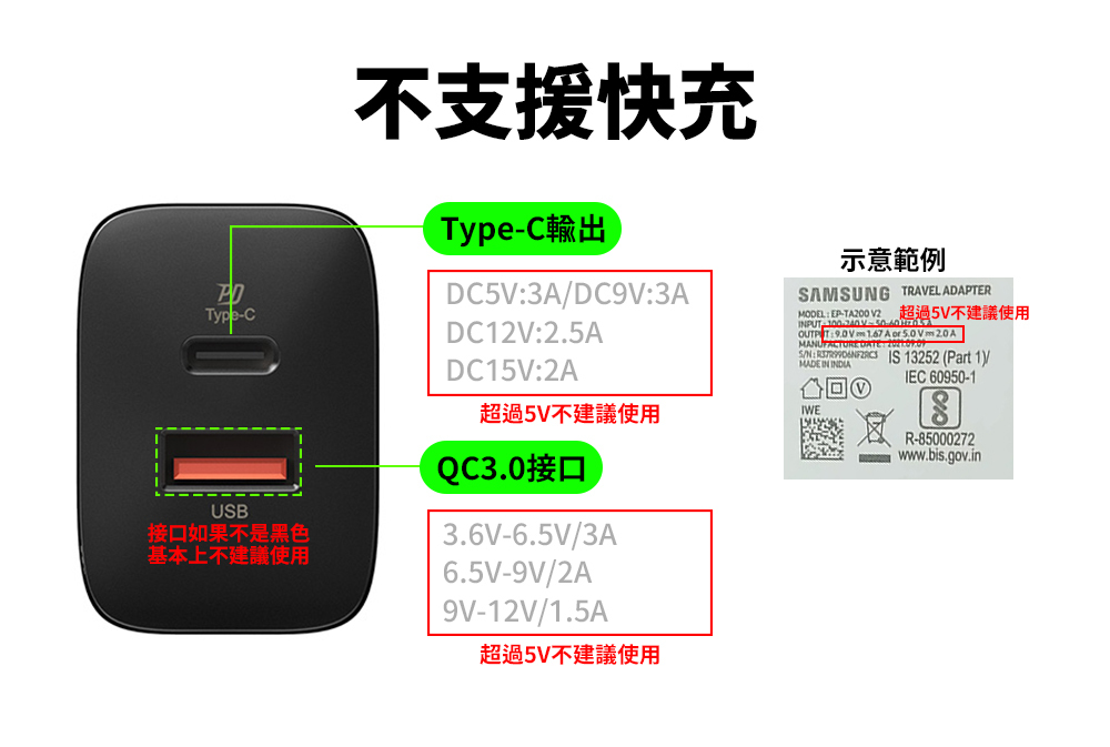 ⚠ 此產品不支援快充頭及線,避免電池過熱及無法充電